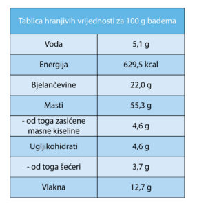 Pogledajte tablicu hranjivih vrijednosti za bademe: